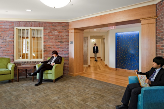 Healthcare hubs have moved beyond being a nurse’s suite tucked away in an obscure corner of campus, as additional staff and spaces are required to provide short- and long-term therapeutic intervention. At Fay School in Southborough, Massachusetts, a new wellness center was designed to meet the needs of health and counseling support for all ages. The space incorporates movement zones, quiet spaces, medication storage and isolation units. These spaces were designed to be as light and comforting as possible, incorporating natural materials, biophilic design principles, serene views and calming colors. The fireplace room, in particular, is designed to be a comfortable group counseling area for daily medications, overnight stays or counseling.
